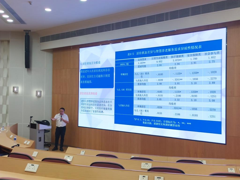 会上,阳程文博士代表课题组作了题为《老年人智慧养老服务需求人口特征差异实证研究——基于对广州1013份调查问卷的分析》的会议报告。围绕“智慧养老”这一社会热点话题,运用多种统计方法,对智慧养老服务体系建设、老年人需求满足等方面进行了系统性分析,获得了与会专家学者的重点关注和肯定,并进行了深度探讨。